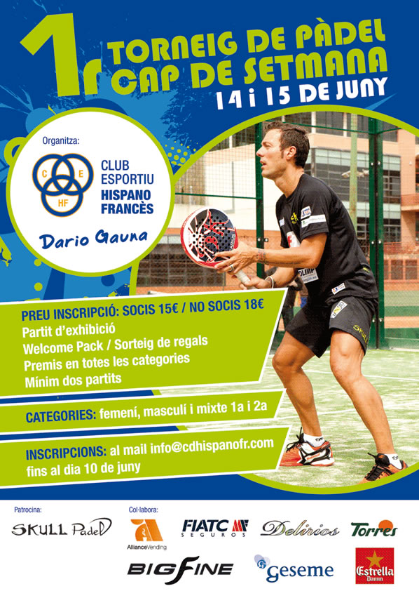 Els propers 14 i 15 de Juny el CE Hispano Francès amb la col·la barió del Dario Gauna organitzarem el 1r Torneig de Cap de Setmana que constarà d’un Welcome Pack per tots el participants i d’un partit d’exhibició a càrrec dels millor professionals de pàdel del nostre país.