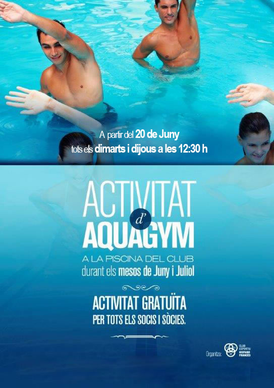 A partir del 20 de juny, tots els dimarts i dijous a les 12:30 h, es farà l’activitat nova d’AQUAGYM a la piscina del Club, durant els mesos de juny i juliol. L’activitat es gratuïta per tots els socis i socies.